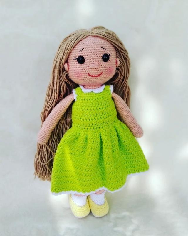 Кукла Иринка сплетена из качественного полукоттона. Кукла Иринка имеет длинные волосы которые можно причесывать и работы разные прически. Иринка может сидеть. Кукла одета в платье, и обута в туфельки. По желанию заказчика можно заказать дополнительный набор одежды.