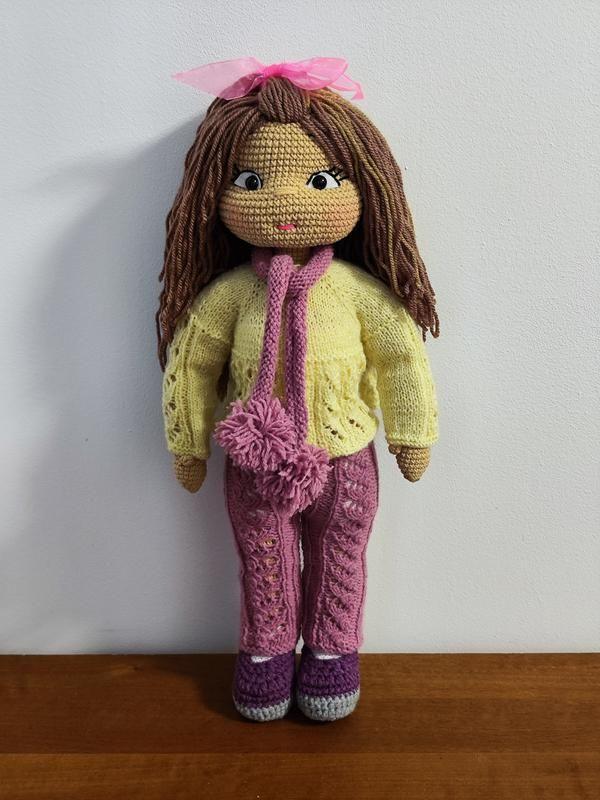 Кукла связана с гипоаллергенной пряжи, наполнена холлофайбером. Размер около 50 см. Имеет несколько комплектов одежды. Стоимость кукулы с 1 комплектом одежды 1200.00 грн Дополнительно можно приобрести другие наборы одежды, которые указаны на фото. Каждый комплект стоит 250.00 грн При покупке всего набора стоимость будет составлять 2000.00 грн(2 платья, 2 пары обуви, 2 пары брюк, 1 купальник, 1 кофтинка, 1 шарф). Также кукла одета в комплект белья