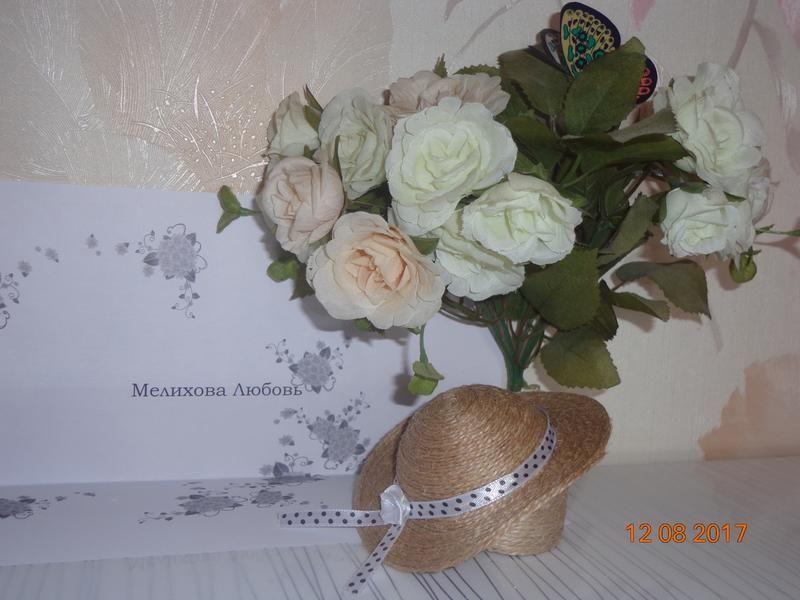 Сувенирные шляпки на букеты, заколки, обручи. Изготовлены из шнура,атласных лент и розочек. Шляпка широкополая:высота-1,5см, диаметр-3,5см, длина шляпки с полями-7см. Шляпка трилби:высота-1,5см, диаметр-3см, длина шляпки с полями-5см. Шляпка канотье: высота-1см, диаметр-3см, длина шляпки с полями-5см. Цена за одну шляпку указанных размеров 15грн., в комплекте 9 шляпок. Возможно изготовление других размеров и выбор цвета атласных лент и розочек по предварительному заказу 2-3дня.