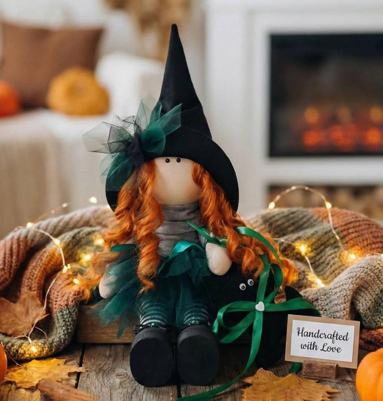 Особливості: інтер’єрна лялька – велика авторська інтер’єрна лялька – Хелловін лялька відьма 37 см у святковому halloween образі рудої ляльки відьми на Хелловін. У ляльці текстильній – відьма авторська лялька шапочка ковпак, одяг та туфельки не знімаються! Текстильна інтер’єрна лялька – оберіг відьма ляльки стоїть самостійно, без опори! У ляльці відьмі Хелловін всі частини тіла – ніжки і ручки – гнучкі!