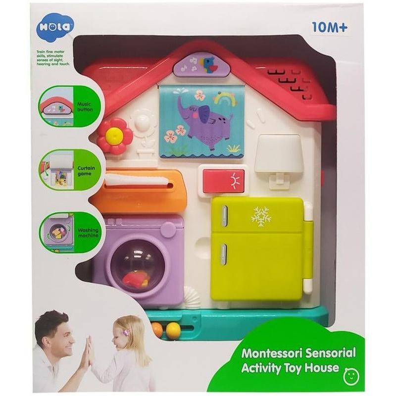 Игровая панель выполнена в форме домика. Здесь вы найдете холодильник, стиральную машину, настольную лампу, диспенсер с салфетками, полотенце и комнатное растение. Каждый игровой элемент имеет подвижные части, сопровождаемые тематическим звуком во время активации. На крыше домика есть цветная кнопка. Нажмите ее и услышите веселые детские мелодии. Внизу домика есть небольшая пальчиковая игра с тремя цветными шариками. Особенности: интерактивная игрушка в форме домика; гармоническое сочетание ярких цветов; 6 активных игровых элементов; музыкальный чип с 10 детскими мелодиями; пальчиковая игра с шариками; регулировка громкости звука; звуковые и световые эффекты работают от 3 батареек типа ААА (в комплект не входят); размер: 17х4х19 см.