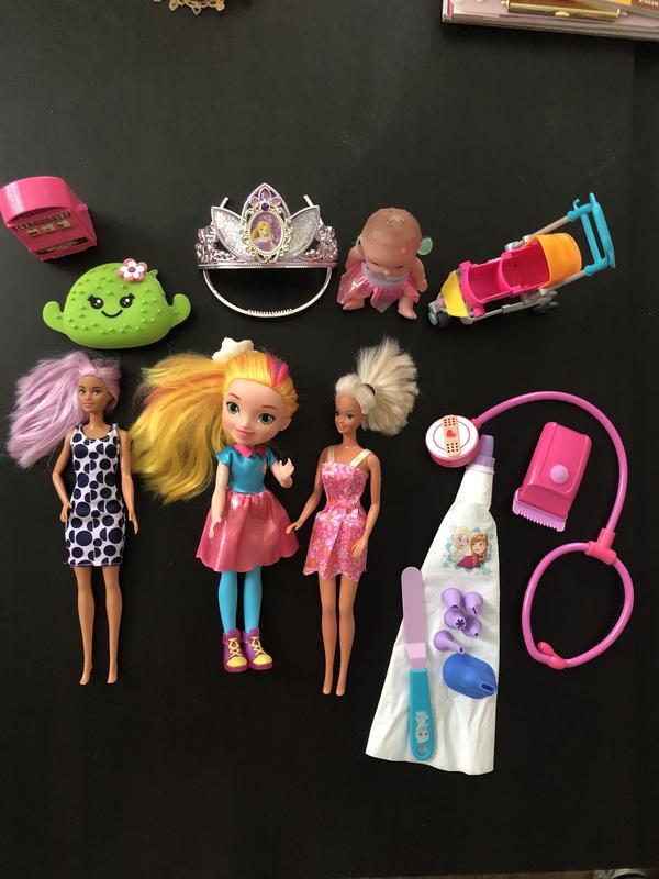 Барби высота30см-двигаются ножки и ручки-80грн Пупсик ангел-высота 14см-двигаются ножки и ручки-70грн Кукла с цветными волосами высота-28см-100грн Сумочка с катиточкой-10на 8см-35грн Калецочка раскладывается на большое и маленькое, переднее колесо движется-50грн Стетоскоп-55грн Лас вегас-при нажатии крутится-30грн Машинка для стрижки на батарейке-70грн Набор для выпечки с насадками70грн Корона 50грн
