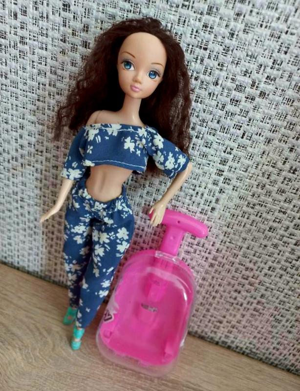 Высота куклы 30 см. Есть пустышки волос но не видны. Комплектация как на фото. Чемодан с выдвижной ручкой.