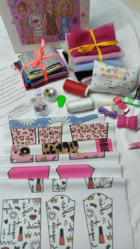 Набор для пошива одежды для куклы Барби (подходит для Барби и кукол с похожими размерами) Набор создан для творческих девочек, которые хотят научиться шить. Это новинка, лимитированное количество наборов !!! Всего 10 наборов, поспешите попробовать наш новый товар!!! Набор состоит из: - набор одежды, напечатанный на ткани, необходимо вырезать по линии и сшить - нитки 3 шт. разного цвета - зажимы для ткани при пошиве - подушечка-игольница + иголки для шитья - ленточки разноцветные для декора - бусинки в мини-контейнерах для хранения, для создания украшений и декора одежды - отрезок фатина для создания дополнительных элементов и пошива - отрезки декоративных тканей для декора и пошива - кнопочки для застежки - липучка для застежки - инструкция Этот набор создавался с тщательным подбором всего необходимого для творческого процесса, чтобы было все необходимое от ткани до застежки и декоративных элементов. Набор рассчитан на деток от 8 лет. На первых этапах помощь взрослого необходима!!! Внимание!! В наборе есть мелкие и острые детали (бусинки /иголки) Желаю успеха маленьким дизайнерам !!!