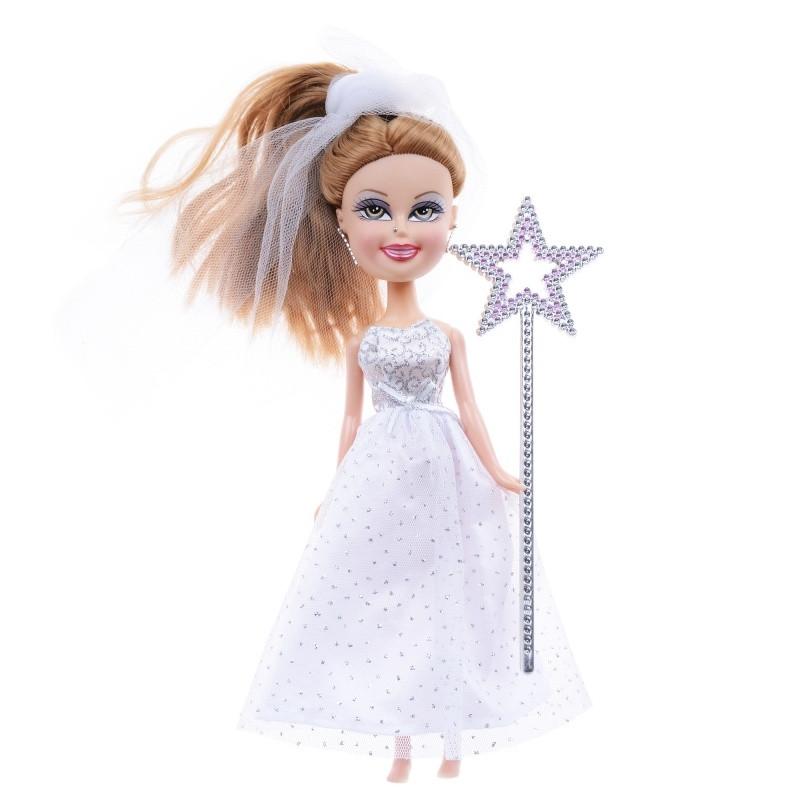 Лялька одягнена в красиве пишну сукню, на голові у неї фата. Також в наборі є чарівна паличка, за допомогою якої лялька може бути доброю чаклункою, феєю або принцесою. Крихітці буде пізнавально грати з такою іграшкою, адже вона придумає безліч казкових сюжетів для своєї гри. Разом з лялькою вони зможуть відправитися на пошуки пригод або ж рятувати землю від зла і лиходіїв, допомагати бідним і добрим людям або лялька відправитися на бал в пошуках принца. У своїй кімнаті дівчинка обладнає місце для своєї гри, а можливо і створить там казкову країну або ж королівський замок. Можна зшити безліч нових нарядів для ляльки, а також зробити різні зачіски на її довге волосся. З такою лялькою добре піде гра як вдома, так і в гостях, а значить, малятко і її подружка будуть завжди нерозлучні. Гра з такою лялькою сприяє розвитку фантазії і уяви вашої дитини. Лялька виготовлена з екологічно чистого пластику, нешкідливого для здоров'я дітвори. Рекомендується для гри дітям від 3 років. У комплект входять: лялька - 1 шт; сукня - 1 шт; чарівна паличка - 1 шт; фата - 1 шт; коробочка - 1 шт.