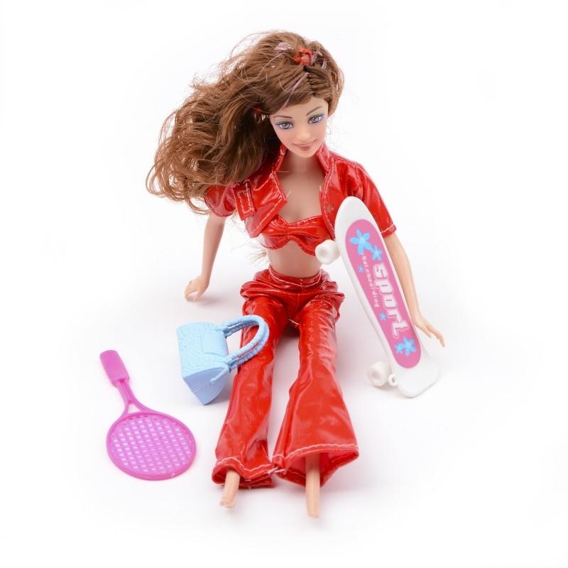 Дана лялька в ігровому наборі зовні виконана у вигляді спортсменки. З такою лялькою дитині захочеться грати і придумувати всякі історії і сюжетні лінії. Лялька одягнена в червоний лакований костюм, який складається з короткогосьпа, штанів і курточки без рукавів. Таке вбрання підійде як для відвідування культурного заходу, так і для звичайних прогулянок. Також в наборі є ракетка для тенісу та скейтборд, а це означає, що своє дозвілля лялька зможе проводити весело і активно. Спочатку катаючись в парку на скейтборді, а потім граючи в теніс на корті зі своєю подружкою. Для того щоб зробити гардероб ляльки різноманітним, ви разом з малечею можете зшити різні сукні, штани, курточки, футболки, сумочки, кепки тощо. Придумайте безліч класних зачісок на її довге волосся. Також щоб лялька постійно відчувала себе в комфорті, дитина може облаштувати для неї будиночок, в який лялька може запрошувати своїх друзів, влаштовувати вечірки, кіно перегляди та чаювання. Від фантазії дівчинки залежить характер гри. Лялька виготовлена з міцного пластику, що не викликає алергічних реакцій і безпечна для здоров'я вашої дитини. Рекомендовано для гри дітям від 3 років. У комплект входять: лялька – 1 шт; ракетка для тенісу – 1 шт; скейтборд – 1 шт; сумочка – 1 шт.