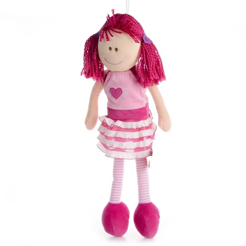 У дитинстві дівчатка однаково люблять грати, що з м'якими іграшками, що з ляльками. Ця м'яка лялька одягнена в рожеву сукню з сердечком посередині, взута в рожеві черевички, на ніжках -смугасті колготки. У неї довге рожеве волосся, з яким ваша крихітка може придумати безліч цікавих зачісок. Також цю іграшку можна підвісити за гачок в будь-яке зручне місце. З такою лялькою дівчинка з першого погляду подружиться і стане кращою подружкою. Разом вони будуть проводити найяскравіші дні і моменти життя. Малятко придумає багато сюжетів для гри. Дитина зможе піклуватися, укладати ляльку спати, вчити її новій інформації, подорожувати у всіх казкових світах, разом рятувати світ. Лялька виготовлена з екологічно чистого штучного матеріалу, всередині набита силіконовим волокном. Гра з лялькою розвиває у дитини дрібну моторику рук, кмітливість, уяву, фантазію, творчі здібності. Грати з лялькою можуть діти старше трьох років.