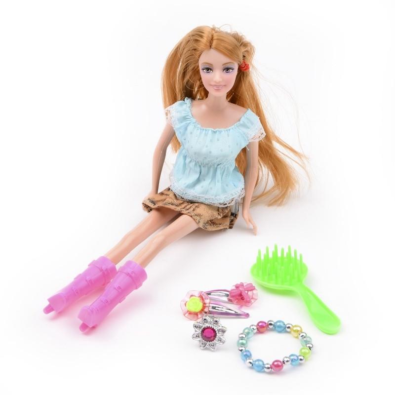 Ігровий набір з такою лялькою сподобається кожній дівчинці. Всі дівчатка в дитинстві люблять грати з ляльками, будувати для них будинки, місця для відпочинку, піклуються про їхній зовнішній вигляд, зачіски, одяг. У цей набір входить лялька, гребінець, каблучка, браслетик і шпильки для вашої крихітки. За допомогою своєї бурхливої фантазії ваша крихітка може придумати цікаву історію або сюжет для гри. Також малеча може запросити подружок, щоб гра була веселою і захоплюючою. Для такої ляльки можна кожен день вигадувати нові і цікаві образи, шити різні вбрання. Лялька може ходити в гості до своїх подружок, відвідувати різні заходи. За допомогою гребінця можна розчесати довге і красиве волосся, а пізніше зробити красиву зачіску. Для того щоб не тільки лялька мала відмінний зовнішній вигляд, в цьому наборі для вашої крихітки є кільця, браслетик і заколки. Тому нехай лялька і ваша крихітка завжди будуть гарні і прекрасні. Дозволяйте вашій дівчинці фантазувати і допомагайте всіляко реалізовувати ці фантазії. Лялька виготовлена з пластику, безпечного для здоров'я дитини. Рекомендується для гри дітям від 3 років. У комплект входять: лялька - 1 шт; гребінець - 1 шт; чоботи - 1 шт; каблучка для дівчинки - 1 шт; браслет - 1 шт; шпильки - 2 шт.