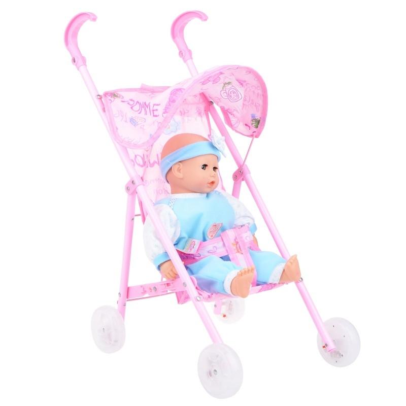 У цей набір входить лялька на батарейках з коляскою, завдяки цим двом складовим, ваша крихітка може придумати стільки сюжетів для своїх ігор. Лялька одягнена в рожевий комбінезон, на голові має пов'язку. Якщо натиснути лялечці на животик, то вона почне видавати звуки, кричати, говорити перше слово «мама», хихикати, посміхатися. Для роботи ляльки необхідні батарейки. У коробці коляска знаходиться в складеному вигляді, але потім її можна розкласти. Зовні вона нагадує нам справжню прогулянкову коляску. Кожне коліщатко підсвічується різноколірними лампочками. У кожному коліщатку є кнопочка включення і виключення, а також відразу вбудовані батарейки. З таким набором можна ходити на прогулянки, насолоджуватися проведеним разом часом. Малюка можна заколисувати, грати з ним в різні ігри, читати йому казки, співати колискові, годувати, лікувати. Набір виготовлений з пластмаси, безпечної для здоров'я дитини. Рекомендується для гри дівчаткам старше трьох років. Тип живлення: AA