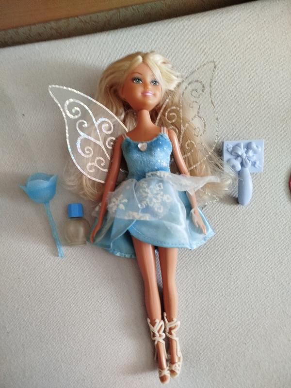 Лялька фея, зимова. Голова, руки, ноги крутяться. В скипетр можно насыпать блестки и они будут высыпаться как будто она колдовает. Бутилка открывается и в нее можно налить обычную воду