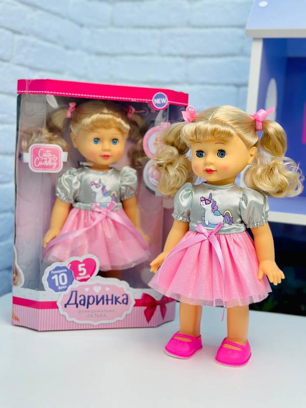 Артикул: 2212 ✍️Описание: 🎀Твоя лучшая подруга, красавица Даринка🥰 Умеет ходить💃🏼говорить💕и петь песни🎶 Украинская озвучка🇺🇦 🎀Говорить 10 фраз 🎀Музыка, звуки🎼 🎀Нажимай кнопку на груди куклы, чтобы услышать фразы📣лічилку🔢 и веселую песню🎼 🎀Хлопья в ладони и Даринка заговорит с тобой🗣️ 🎀Загадает тебе интересную загадку❓ 🎀Будет ходить за тобой, как настоящая девочка👧 🎀Упакована в красивую подарочную упаковку🎁 🎀Поможет увеличить словарный запас Вашего ребенка🧒 🔋Работает от батареек "ААА" 3шт. (не прилагаются) 📐Размер: 32см