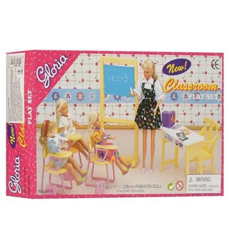 Набор мебели Gloria (школа) Глория- это мебель маленького размера, которая подходит только для кукол размером до 30 см, особенно сочитаеться с куклами Барби. Разные виды, большой ассортимент, куча вариантов этой серии помогут вам обустроить дом. Набор мебели Gloria 9916 безупречно подходит для игр с куклами и кукольными домиками MagicHouse. Этот прекрасный набор, точно понравится вашей принцессе. Каждая деталь мебели продумана до мелочей и очень функциональна. Мебель изготовлена из качественного пластика. Материал не имеет запахов, не токсичен, не имеет сколов, полностью безопасен для игр детей! Игровой набор совместим со всеми куклами и домиками для кукол в стандарте Барби или Братц (высота куклы до 30 см). Рекомендуемый возраст для игры - от 3‑х лет.