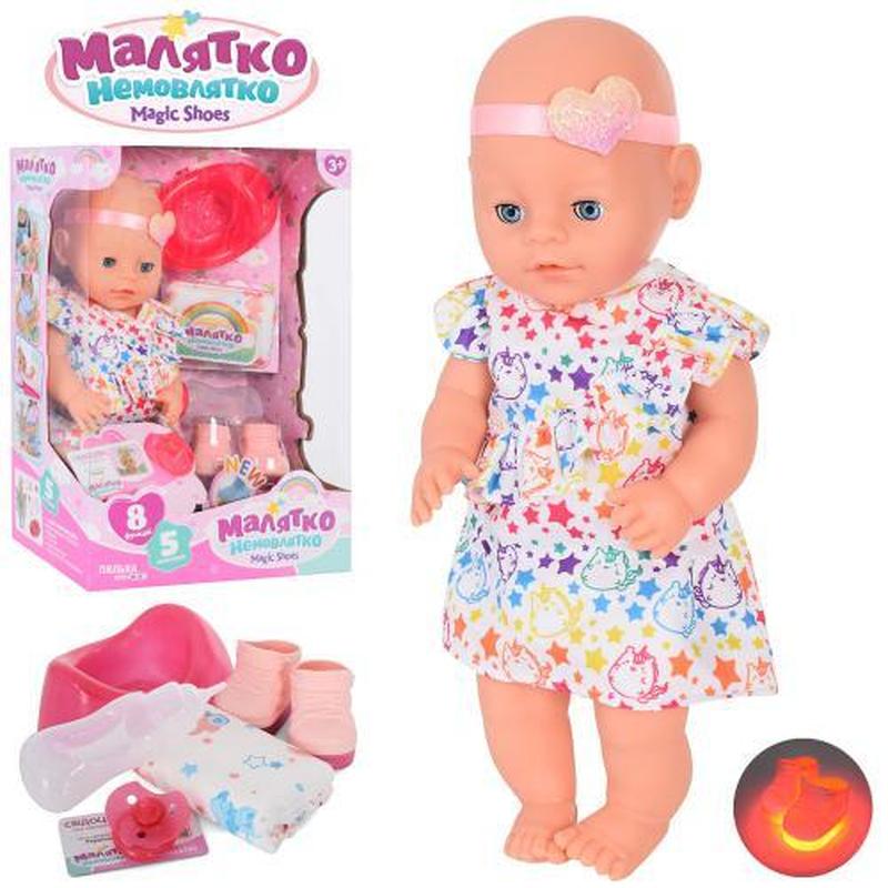 Пупс "Малятко-немовлятко", 40 см. В наборі - пляшечка, горщик, соска, підгузник. Лялька п'є та пісяє. Має 8 функцій. Черевички ляльки з підсвічуванням. Живленн — батарейка типу таблетка. Матеріал - комбінований. Паковання — коробка. Розмір - 26,5х15,5х38 см.