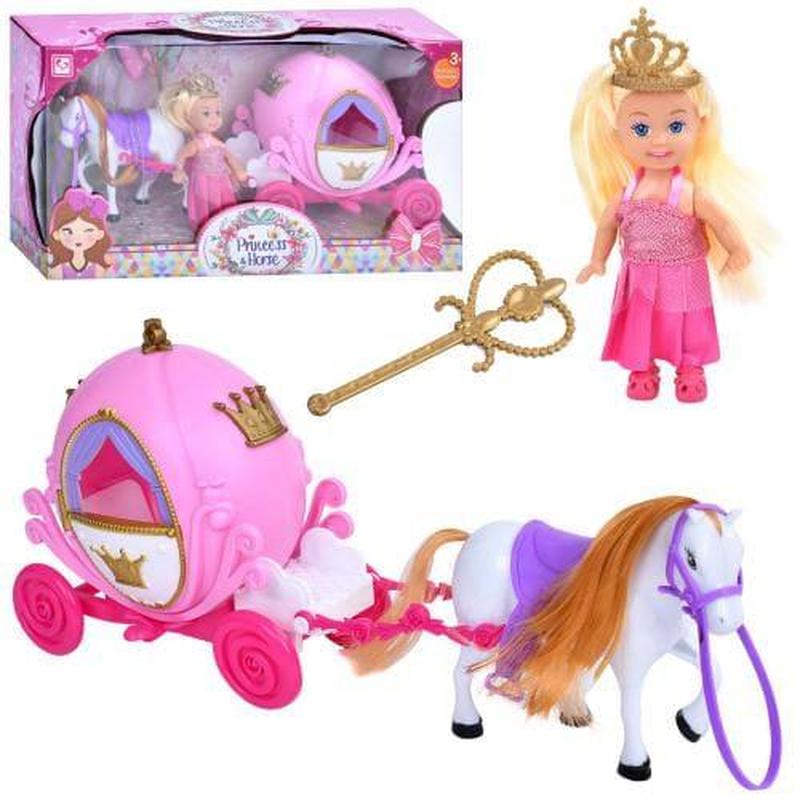Лялька з каретою та конем. Розмір - карети 34 см, ляльки 12 см. Аксесуари в наборі. Матеріал - комбінований. Упаковка - коробка. Розмір - 37х10х19,5 см.