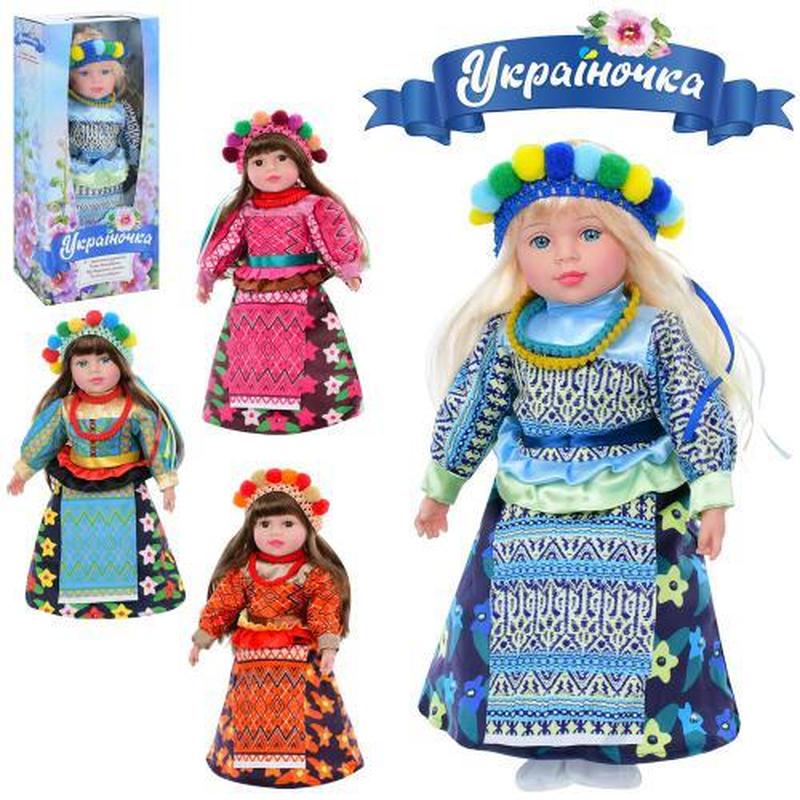 Лялька м'яконабивна "Україночка", 47 см, 4 види. Національне вбрання, довге волосся. Співає гарну пісеньку українською мовою. Живлення - батарейка типу таблетка. Матеріал - комбінований. Упаковка - коробка. Розмір - 23,5х12х49 см.
