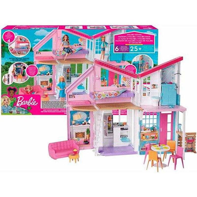 Игровой набор Барби Дом в Малибу Barbie Malibu House Playset FXG57 Игровой набор Барби "Дом в Малибу" (Barbie Malibu House Playset FXG57) - это набор для игры, который включает в себя дом для кукол Барби и различные аксессуары. Этот набор дарит детям возможность создавать собственные истории и приключения для кукол Барби. Обычно в набор входят следующие элементы: 1. Двухэтажный игровой дом, состоящий из 6-ти комнат: прихожая, кухня, спальня, гостиная, ванная комната, туалет, детская комната. 2. Также в наборе есть аксессуары: диван, обеденный стол, стулья, блендер, тарелки, барбекю, фен и щетка для волос, маленький стульчик и ножка для ног, полотенца и несколько видов продуктов питания. 3. Аксессуары для игры, такие как посуда, одежда, украшения и многое другое. Этот набор позволяет детям реализовывать свои фантазии и развивать творческие навыки, создавая различные сцены и истории для кукол. Наборы для игры с куклами Барби обычно пользуются популярностью среди девочек, которые любят играть в ролевые игры и создавать свои собственные миры для кукол. Обратите внимание: Куклы не входят в комплект. Покупайте уже сегодня!"