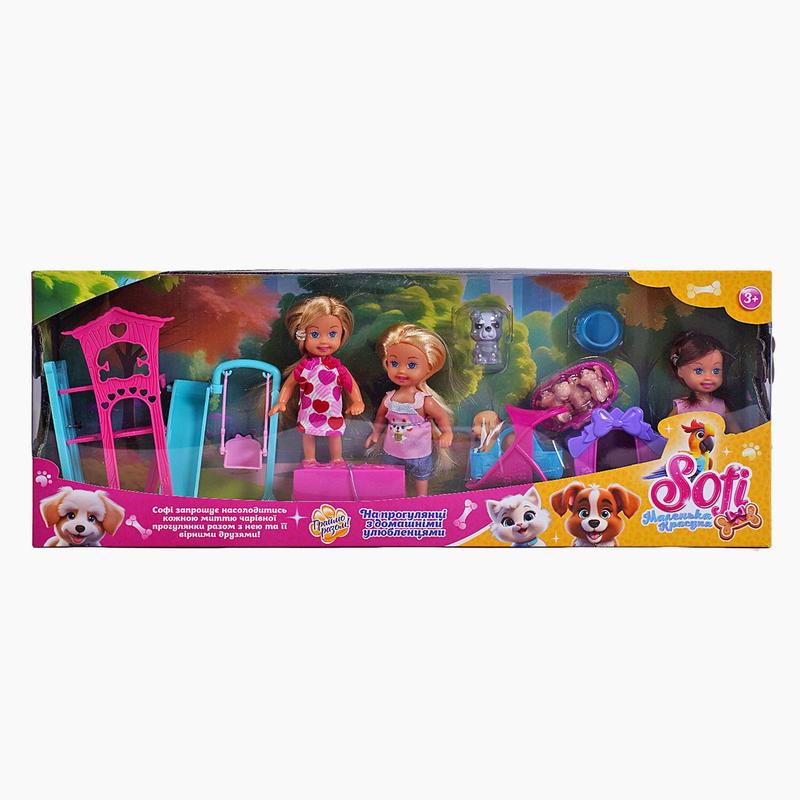 Sofi приглашает насладиться каждым мгновением волшебной прогулки вместе с ней и ее верными друзьями! Во время прогулки они собирают яркие листочки, играют в прятки и делают множество снимков в память. Sofi - отличный компаньон для всех, кто любит приключения и заботиться о своих домашних любимцах. Вместе с Sofi и друзьями каждая прогулка становится неотразимой! Особенности: - игрушечный набор в тематике "На прогулке с домашними питомцами"; - включает 3 куклы и дополнительные аксессуары; - куклы имеют длинные шелковистые волосы и выразительные черты лица; - игрушки одеты в съемную одежду; - высота куклы составляет 11 см; - тело кукол выполнено из пластика, а голова - из резины. Комплектация: - 3 куклы; - детская площадка с качелями; - 3 щенка в корзине; - собачка в коляске, - собачка с домиком.