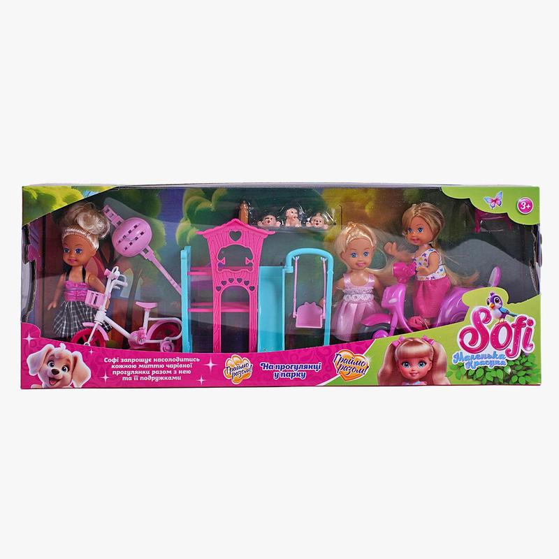 Яка б не стояла на вулиці погода, Софі зі своїми подружками завжди влаштовують прогулянки парком. Тут повсякчас вирують цікаві події, кипить життя і можна обрати розвагу до душі: насолодитися катанням на улюбленій гойдалці, влаштувати перегони на велосипедах або проїхатися звивистими доріжками парку на електричному скутері! Особливості: - іграшковий набір в тематиці "На прогулянці у парку"; - включає 3 ляльки та додаткові аксесуари; - ляльки мають довге шовковисте волосся та виразні риси обличчя; - іграшки вдягнені у знімний одяг; - висота ляльки складає 11 см; - тіло ляльок виконане з пластику, а голова - з гуми. Комплектація: - 3 ляльки; - дитячий майданчик з гойдалкою; - скутер, велосипед та 2 захисні шоломи; - 3 цуценяти з пляшечкою для годування.