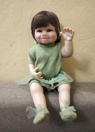 Тело войло винил-силикон. Руки, ноги и голова подвижные, кусла может сидеть и лежать. Глаза не закрываются. На веках пушистые ресницы. Длинные волосы. Кукла одета в вязаный комбинезон, ботиночки вязки. Соска на магните, бутилочка в комплекте. Свидетельство о рождении (можно написать имя). Характеристики: Вес: 1,6 кг Рост: 52см Статт: девочка Тело: винил-силикон Глаза: открытые, не закрываются Волосы: парик Комплектация: Свидетельство о рождении Обувь и одежда как на фото Соска, бутылочка, памперс.