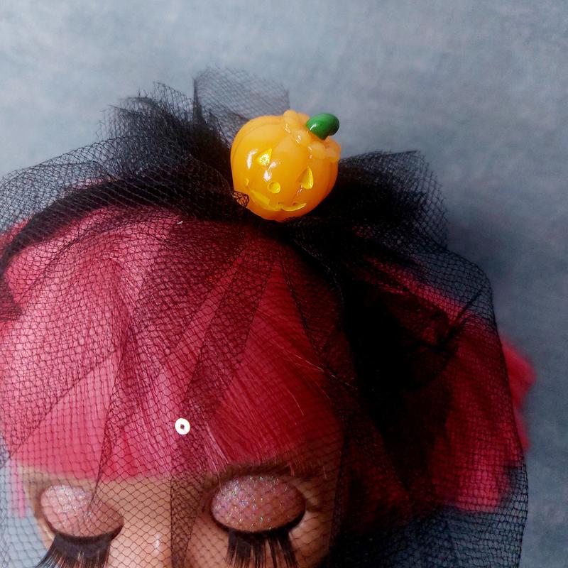 Обруч для куклы Блайз для Хеллоуина. Тыква Основа металл. Декор репсовая лента, фигурка в виде тыквы, вуаль из фатина Диамерт 8 см. Чудесный аксессуар для вашей куклы
