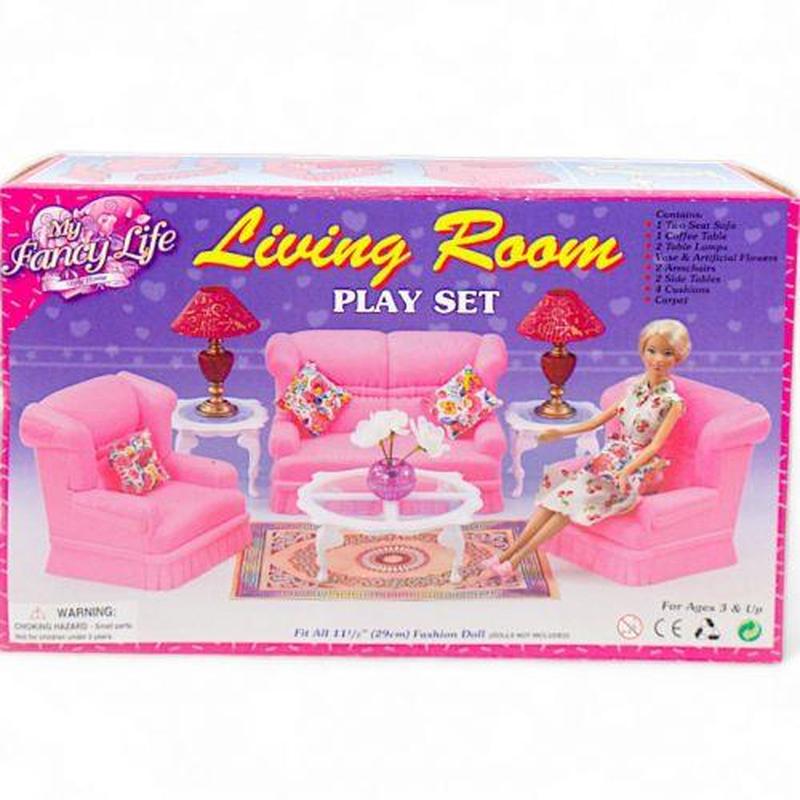 Детский игровой набор мебели для кукол "Гостиная" включает все необходимое для создания уютного пространства: диван, 2 кресла, кофейный столик, 2 приставных столика, 4 подушки, 2 настольные лампы, ковер и вазу с цветами. Подходит для стандартных кукол типа Барби (29-30 см), идеально дополняя их домик.