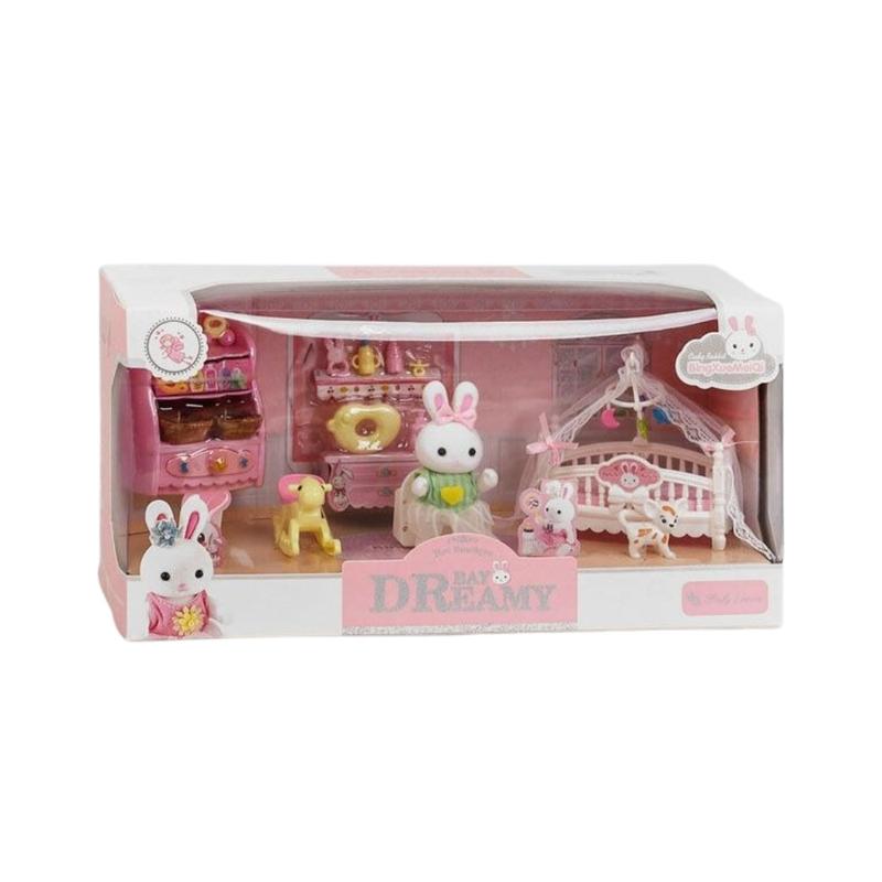 Комплектация: - флоксовая зайка; - любимец; - кроватка с балдахином; - скалка; - комод с корзинами для аксессуаров; - разнообразные аксессуары по уходу за малышом.