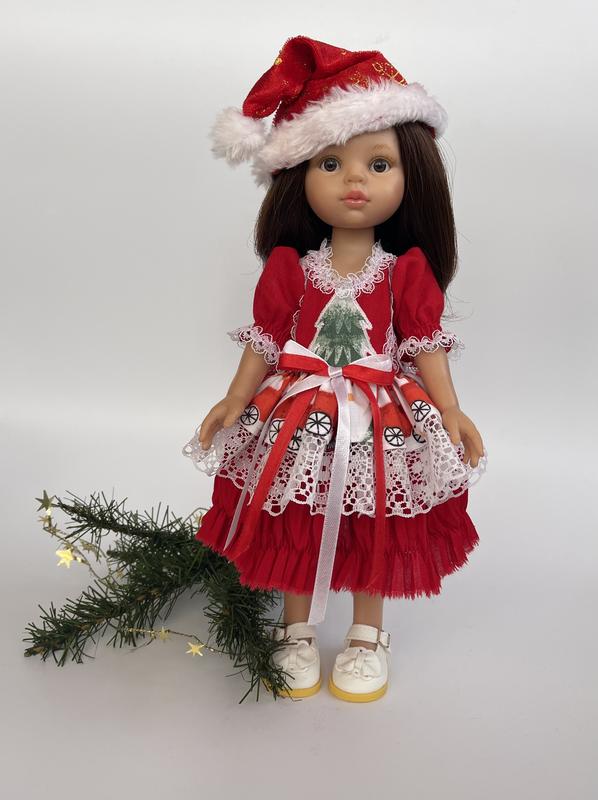 Новогоднее Хлопковое платье с кружевом, аппликацией и лентами для любимой куклы. Паола Рейна 32 см.