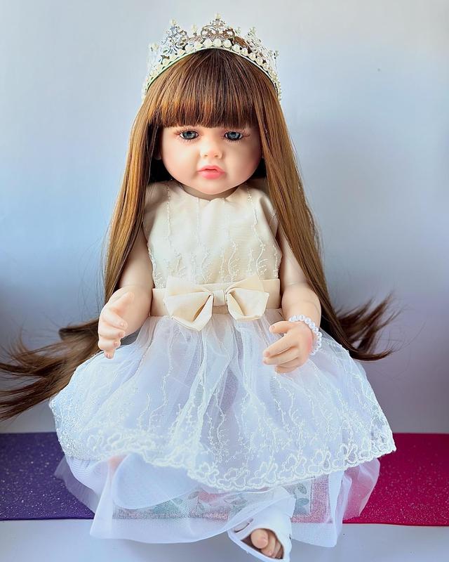 Привет! Я хочу быть твоей подружкой. Выполнена я из высококачественного винил-силикона. Меня можно купать. Я могу сидеть, стоять (с опорой) и лежать. Мне можно делать прически, волосы длинные, приятные на ощупь, как у человека. Мочить волосы мне не рекомендовано, поэтому при купании надевайте мне защитную шапочку. Мой рост 55 см. Я одета в белое с молочным верхом праздничное платье с кружевом. Также, свои ножки обуты в белые босоножки. На голове у меня корона. Имею с собой магнитную пустышку, бутылочку, памперс 🤍✨ Я жду тебя.☺️