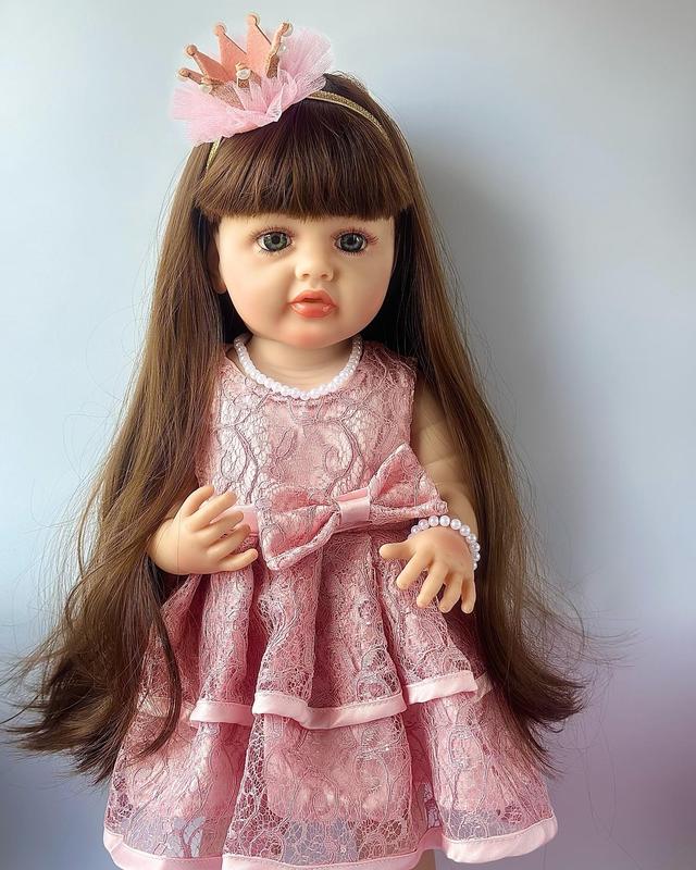 Привет! Я хочу быть твоей подружкой. Выполнена я из высококачественного винил силикона. Меня можно купать. Я могу сидеть, стоять и лежать. Мне можно делать прически, волосы длинные, приятные на ощупь, как у человека. Мочить волосы мне не рекомендовано, поэтому при купании надевайте мне защитную шапочку. Мой рост 55 см. Я одета в праздничное кружевное розовое платье. Также, свои ножки обуты в белые носочки и туфельки. На голове у меня корона. Имею с собой магнитную пустышку, бутылочку, памперс 🩷✨ Я жду тебя.☺️