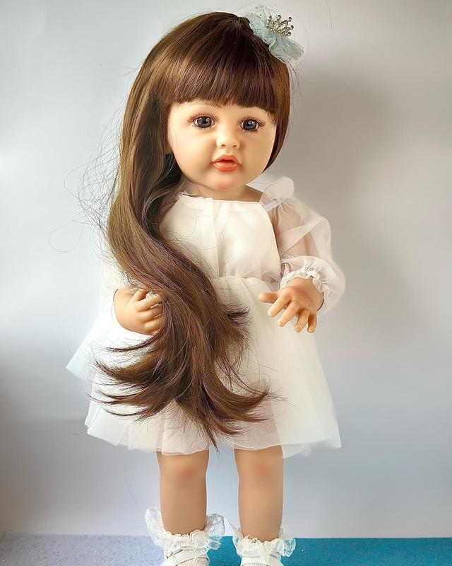 Привет! Я хочу быть твоей подружкой. Выполнена я из высококачественного винил силикона. Меня можно купать. Я могу сидеть, стоять (с опорой) и лежать. Мне можно делать прически, волосы длинные, приятные на ощупь, как у человека. Мочить волосы мне не рекомендовано, поэтому при купании надевайте мне защитную шапочку. Мой рост 55 см. Я одета в белое фатеновое платье. На голове у меня голубая заколка с короной. Также, свои ножки обуты в белые носки и белые туфельки. Имею с собой магнитную пустышку, бутылочку, памперс 🤍✨ Я жду тебя.☺️