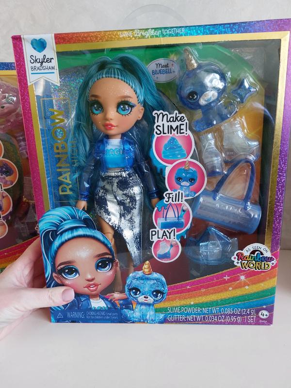 Лялька Rainbow High Skyler Лялька Rainbow із серії Classic - це справжній вибух моди та стилю, що відкриває світ нескінченної творчості та гри. Скайлер, що є однією з шести ляльок цієї колекції, одягнена в приголомшливе яскраво-синє вбрання, виділяється своїм довгим волоссям насиченого кольору і підкреслює індивідуальність кожної маленької модниці. Ця красуня не тільки тішить око своїм образом, а й пропонує унікальну функцію - можливість додавання сяйва до її аксесуарів. Використовуйте слайм із блискучим шимером, щоб додати блиску сумці, знімним підборам або навіть її улюбленцю, створюючи нескінченні варіанти гри та стилю. Особливості: повна артикуляція ляльки; обличчя красуні прикрашене блискітками; довге розкішне волосся, яке можна розчісувати та створювати різні зачіски; милий улюбленець з ефектом кристала. До набору входять: 1 лялька (висота28см), 1 комплект одягу, 1 пара взуття, 1 сумка, 1 улюбленець, 1 слайм, 1 шимер, 1 гребінець, 1 підставка для ляльки.