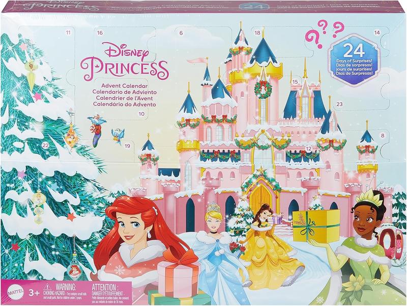 Адвент календар натхненний принцесами з фільмів Діснея, це календар, що дарує 24 дні сюрпризів принцес Діснея на свята. Дітям сподобається відлік до свят із 24-денними подарунками: особливий сюрприз, який відкривається щодня. Подарунки включають 4 маленькі ляльки принцеси (9 см) Тіану, Попелюшку, Аріель і Бель зі спідницями, що знімаються та зимовими накидками. Також містить 4 фігурки друзів: Флаундера та Себастьяна з «Русалоньки», Жака з «Попелюшки», Люм’єра з «Красуні та чудовиська» та Навіна з «Принцеси та жаби». Пакет містить зимову сцену для ігор і демонстрації сюрпризів, а також додаткові ігрові елементи, що висуваються, як-от святкова ялинка та сніговик. Для дітей від 3-х років.