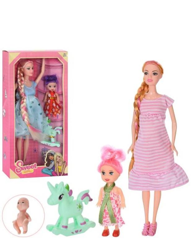 Наборе: кукла 29см имеет длинные волосы, беременная, дочь 10см, пупс 3см, лошадка-качалка