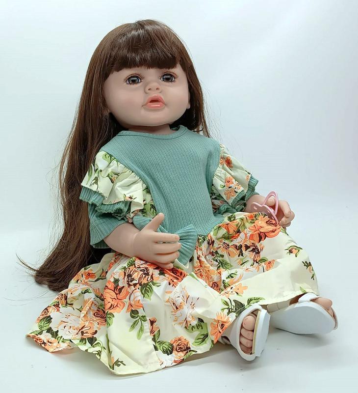 Кукла Реборн Yi Wu Jiayu "Baby doll" модель AD8819-107 представляет собой восхитительное творение, которое поразит вас своей детализацией и реалистичностью. Эта очаровательная кукла обладает длинными каштановыми локонами, которые аккуратно уложены и украшены милым бантом на голове, добавляя ей игривости и нежности. Особое внимание заслуживает её одежда: кукла одета в легкое зеленое платье в цветочек, которое дополнено белыми туфельками, которые идеально сочетаются с общим стилем наряда, делая образ завершенным и продуманным до мелочей. Кукла изготовлена с использованием высококачественных материалов: голова, ручки и ножки выполнены из мягкой резины, что придает ей приятную на ощупь текстуру и увеличивает реалистичность. Тело куклы набито мягкой тканью, что делает её удобной для обнимашек и игр. Размер куклы составляет 55 сантиметров, что делает её идеальной как для игровых моментов, так и для коллекционирования. Кукла оснащена механизмом, работающим от трех батареек типа АА (не входят в комплект), благодаря которому она может смеяться, плакать, бормотать и даже имитировать дыхание, создавая удивительно живые и эмоциональные моменты взаимодействия. В комплекте с куклой идут аксессуары, которые усиливают игровой процесс и делают его более разнообразным: соска на магните для удобства крепления, бутылочка для кормления и памперс, что добавляет реалистичности в уход за куклой. Кукла Реборн Yi Wu Jiayu "Baby doll" музыкальная 55 см AD8819-107 -- это не просто игрушка, это произведение искусства, которое принесет радость и тепло в дом, станет верным другом вашему ребенку и прекрасным дополнением к коллекции любителя кукол.