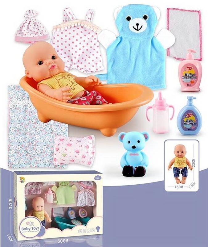 Ігровий набір "Baby Toys" чудово підійде для малечі, яка обожнює бавитись з ляльками та пупсиками. В ньому знайдеться все необхідне для догляду за іграшковим дитинчам: простора ванна, симпатичний одяг, затишна постіль, іграшка та пляшечка із сумішшю для годування. Особливості: - висота пупсика - 21 см; - пупсик виготовлений з якісної гуми; - іграшка має рухливі ручки, ніжки та голову; - пупсик одягнений у яскраву маєчку та шортики; - у комплекті представлені додаткові аксесуари для догляду за ляльковим немовлям, одяг та ванночка. Комплекція: - пупс; - ванночка; - пляшечка для годування; - 2 пляшечки, що імітують засоби по догляду; - іграшковий ведмедик; - подушка та ковдра; - комбінезон; - шапочка; - рукавичка для лялькового театру. Розмір упаковки: 50 см × 15 см × 37 см