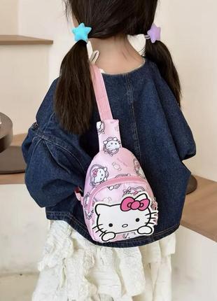Детская сумка с персонажем Hello Kitty через плечо, или можно использовать как нагрудну. Она не большая, но очень вместительная: телефон кошелек, небольшие игрушки,всегда будут рядом с малышкой. Еще ее используют деткам в садик. Качество сумки красивое: нейлон. Размеры: 13*18 см Регулируемый плечевой ремень от 49 до 93 см