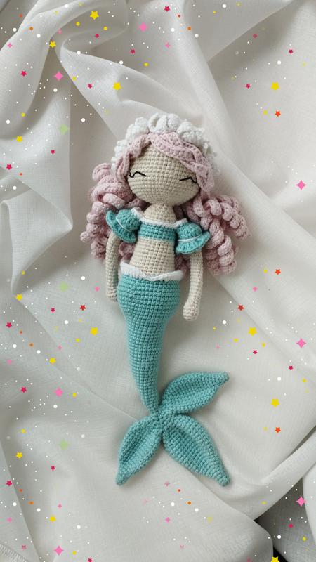 Продам в'язану куколку крючком ручної роботи виконана з гіпоалергенної пряжі Висота куколки 29 см (22 см до плавників) В ручки вставлений каркас за допомогою якого вони згінаються Очі на безпечному кріпленні