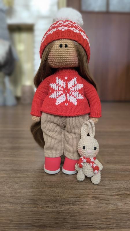 Вязаная кукла ручной работы в стиле тильда. Кукла только стоит, ножки не сгибаются. Вся одежда снимается: шапка, брюки, кофточка, мокасины. Волосы можно расчесывать. Глазки вышиты. Куклу можно осторожно стирать. Сушить в горизонтальном положении. Зайка йде в комплекті. Размер игрушки куклы около 30см. Отправлю упакованную в коробке. Отправка Безопасной оплатой.