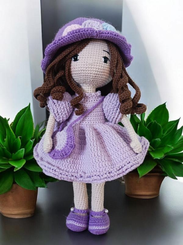 Кукла сплетена крючком в технике аммигуруми, рост 35 см. Материал - хлопок+акрил (YarnArt jeans). Наполнитель - холлофайбер. В руках куклы есть каркас - флористический провод, для гибкости. Глаза пластиковые, на безопасном креплении. Шляпа, платье и ботиночки при желании снимаются.