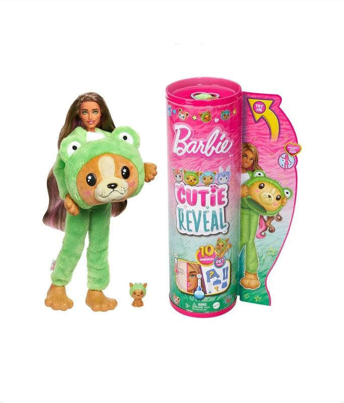 Кукла Barbie Cutie Reveal Чудесное комбо Щенок в костюме лягушки, 29 см, от 3 лет Десять сюрпризов в одном тубусе — кукла Barbie Cutie Reveal в костюме животного предлагает уникальный опыт распаковки! Это отличный подарок для ребенка в возрасте от 3 лет. Как играть? Вот и наступил волшебный момент распаковки. Открывайте для себя щенка в костюме зеленой лягушки. Снимите плюшевый наряд и сразу увидите стильную куклу Barbie с невероятными длинными цветными волосами. На этом сюрпризы не заканчиваются. Еще есть пара обуви, кошелек, сумочка и миниатюрный домашний любимец внутри. А теперь возьмите ледяную холодную воду, она меняет цвет лица куклы и собачки, а теплая возвращает их вид обратно.