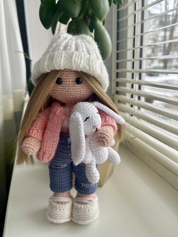 Вязаная кукла ручной работы Мыловидная интерьерная куколка, созданная с любовью и вниманием к деталям. Она одета в стильные вязаные джинсы, розовый свитерик, теплую белую шапочку и удобные тапочки. В руках держит милого вязаного зайчика, что добавляет ей еще больше очарования. Материалы: гипоаллергенная пряжа, безопасные глазки, наполнитель холофайбер. Размер: около 25 см Идеально подходит для подарка на день рождения, Новый год, 8 марта или просто для создания уюта в вашем доме. Уникальная работа – каждая куколка изготавливается вручную! Доставка по всей Украине. Пишите в сообщение для заказа!