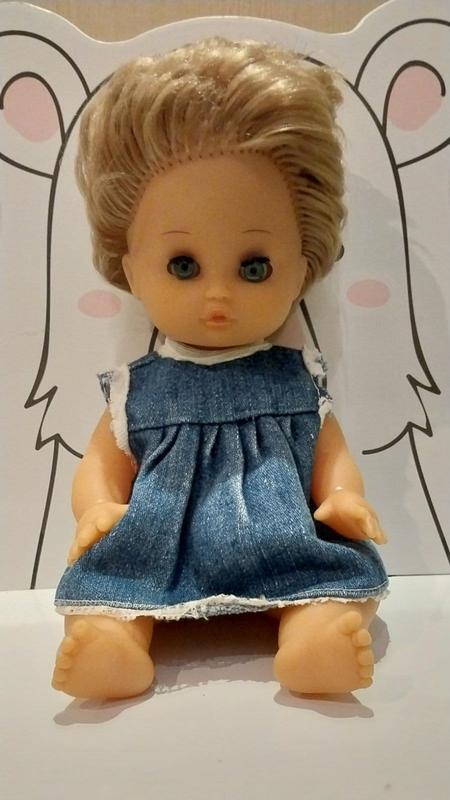 Лялька Німеччина, з коротким волоссям та в натуральному джинсовому платті. Висота 28см. Вживане, в хорошому стані.