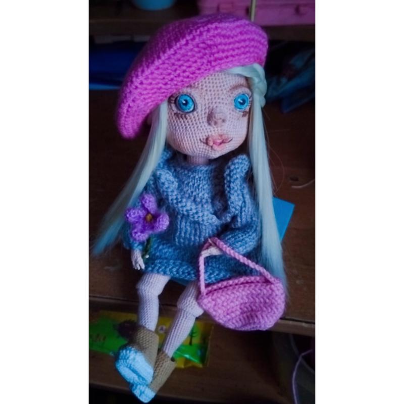 Шарнирная кукла вязаная крючком. Ручная работа. Глаза вязаные. Парик снимается по желанию мочиться, чтобы не снимались. Ручки и ножки подвижные.,ноловая поворачивается. Личико затоноване. Рост куклы 24 см. Под заказ.