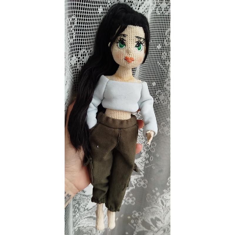 Вязаная кукла крючком. Глаза вшиты. Проволочный каркас. Одежда пошита вручную. Рост 30 см. Волосы из пряжи