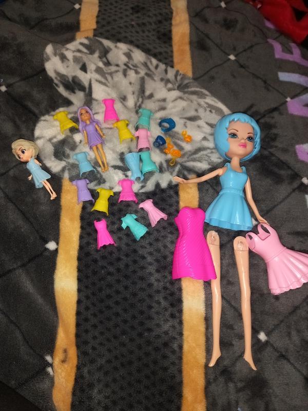 Продам куклу с одеждой на одну маленькую подходят все маленькие платья и сумочки размер 9 см . У большой 3 платья ноги отложены. На вторую маленькую только одно платье