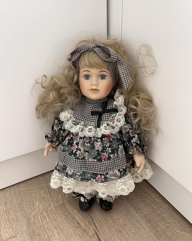 фарфорова колекційна лялька висотою близько 30 см, у класичному вінтажному стилі, з акуратно зробленим одягом і перукою - в ідеальну стані!