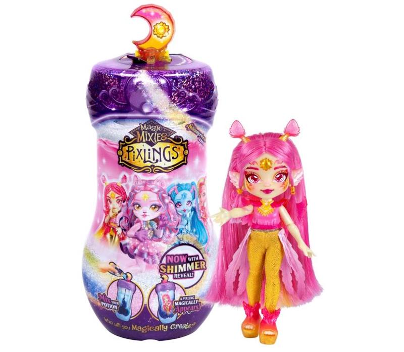 Серия кукол Magic Mixies Pixlings Shimmervers! Смешайте зелье, и кукла волшебным образом появится! Наливаем в бутылочку воду, добавляем специальные ингредиенты согласно инструкции и произносим заклинание "Волшебный миксус", затем поворачиваем и нажимаем на пробку в виде хрустальной луны. Зелье переливается и становится прозрачным, открывая сухую куклу Pixling. Высота куклы 16,5 см. Производитель: Moose