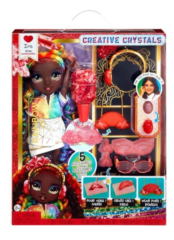Лялька Rainbow High Creative Crystals Iris - Rainbow 11” Fashion Doll with Crystal Accessory Make It Kit, Ring for You, DIY, Crafts, Resin Play, Kids Gift 8+. Набір для виготовлення кристалічних аксесуарів містить усе необхідне для виготовлення 5 модних аксесуарів із кришталю своїми руками для вашої модної ляльки та вас, включаючи смолу, форми та аксесуари. 6 НАБОРІВ ДЛЯ ВИГОТОВЛЕННЯ: Зробіть нашийник, сонцезахисні окуляри, сережки, гаманець і пов’язку на голову з кристалів для вашої ляльки. І зробить тобі каблучку з кришталю. Просто налийте смолу у форму. Поставте на сонячне світло на кілька хвилин. Вийміть кристал із форми. Вставте кристал у додаткове обладнання. Лялька рухлива, її легко налаштувати, і з нею весело грати. Її руки та ноги згинаються в стільки веселих поз, включаючи шпагат!