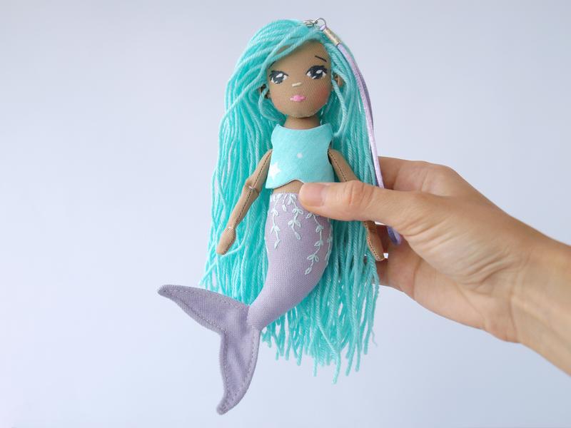 Кукла русалка Рост 21 см Имеет петельку благодаря которой можно закрепить на рюкзак в виде брелока При желании, петельку можно снять Украшена ручной вышивкой, кофточка снимается. Волосы можно расчесывать и заплетать косы.
