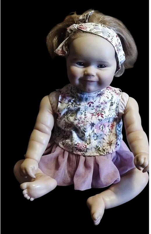 Милая кукла-реборн от NPK с мягким тканевый телом, силиконовыми головой и конечностями. Малышка со светлыми прошитыми волосами, вставными акриловыми глазами, ручной росписью лица и тела. Конечности могут свободно двигаться. У куколки задорная улыбка и уже один зуб. Размер: Высота - 50 см. Материалы: Силикон, ткань.